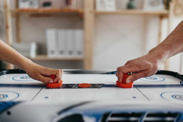 Air hockey is a tabletop sport where two opposing players try to score goals against each other on a low-friction table using two hand-held discs.